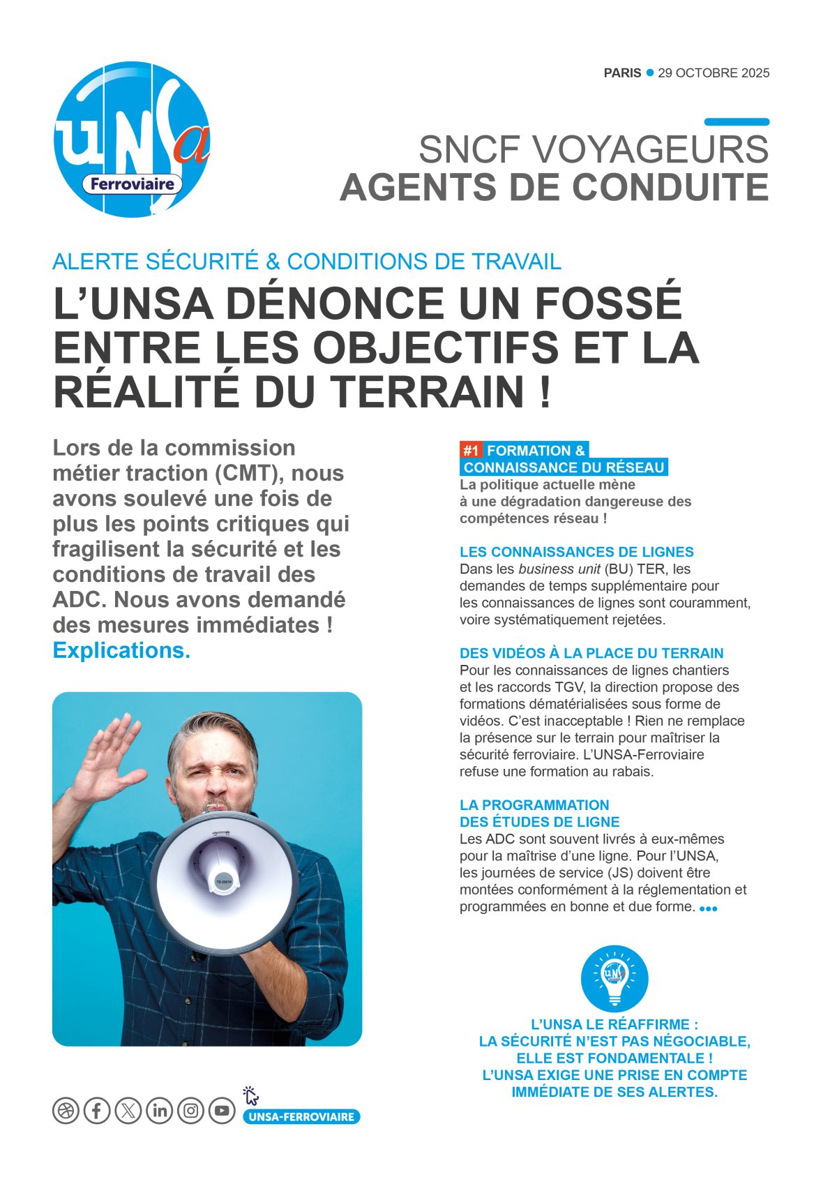 Nous alertons sur une dérive inquiétante : la sécurité des ADC et leurs conditions de travail se fragilisent tandis que les exigences explosent. L’UNSA-Ferroviaire dévoile des pratiques qui mettent la formation, la préparation et la production sous tension permanente. Nous exigeons des mesures immédiates pour protéger les agents et remettre la sécurité au centre.