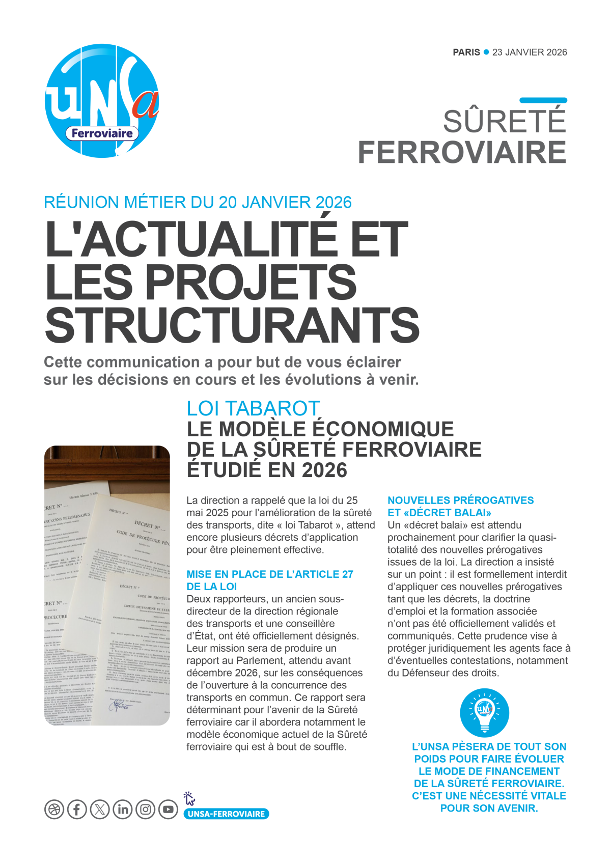 Lors de la réunion Sûreté du 20 janvier 2026, nous faisons le point sur l’application de la loi Tabarot, encore incomplète, et sur les évolutions à venir : prérogatives, armement, caméras-piétons et financement de la Sûreté.