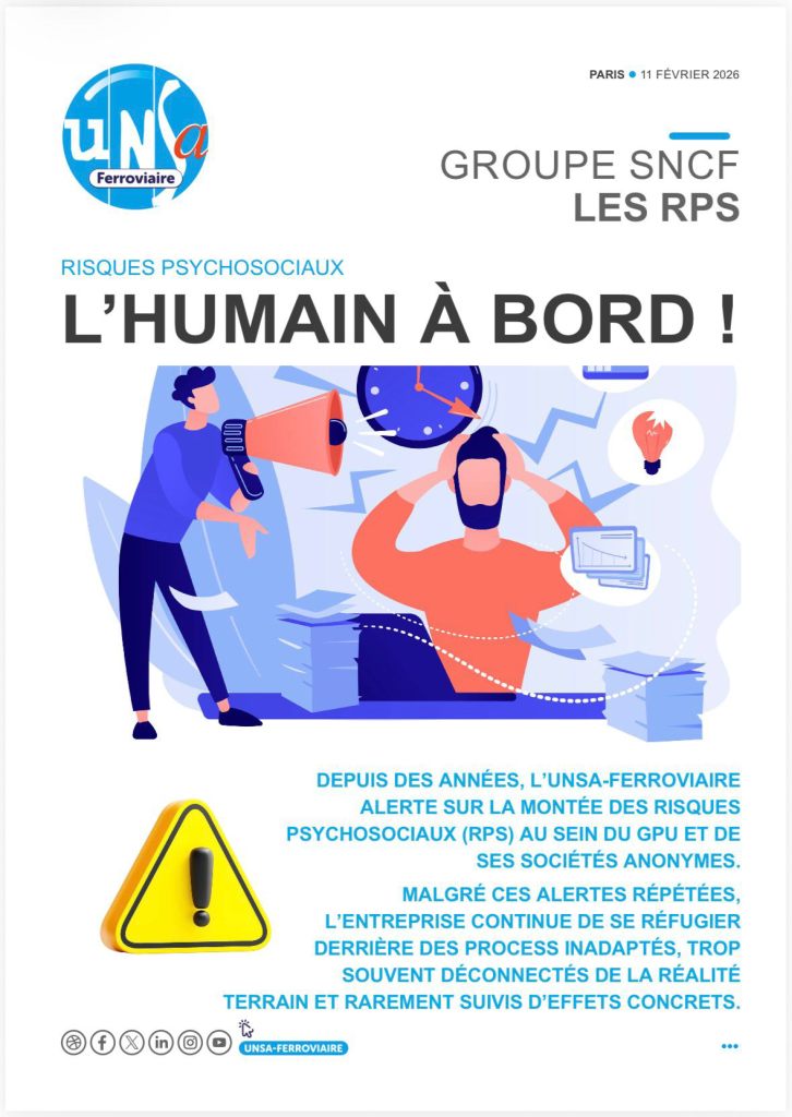 Face à la montée des risques psychosociaux au sein du Groupe SNCF, l’UNSA-Ferroviaire alerte sur la dégradation des conditions de travail et l’absence de réponses concrètes adaptées au terrain. Elle exige des mesures fortes : comblement des postes vacants, évaluation réelle des RPS, reconnaissance de la pénibilité, respect des avis médicaux et remise de l’humain au cœur des décisions pour protéger la santé mentale et physique des salariés.