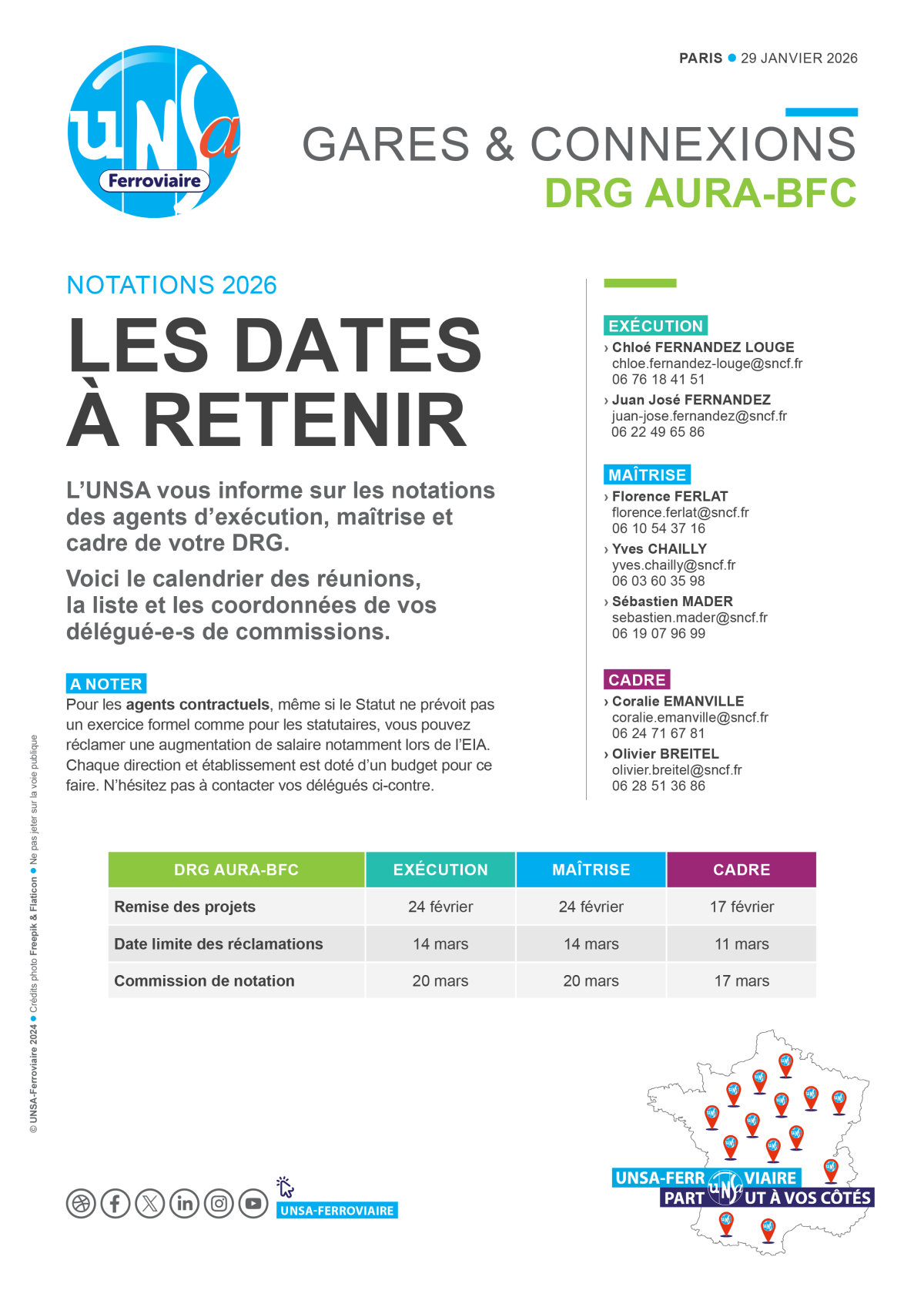 L’UNSA informe les agents de la DRG AURA-BFC des dates clés des notations 2026 (remise des projets, réclamations et commissions) pour les collèges exécution, maîtrise et cadre.