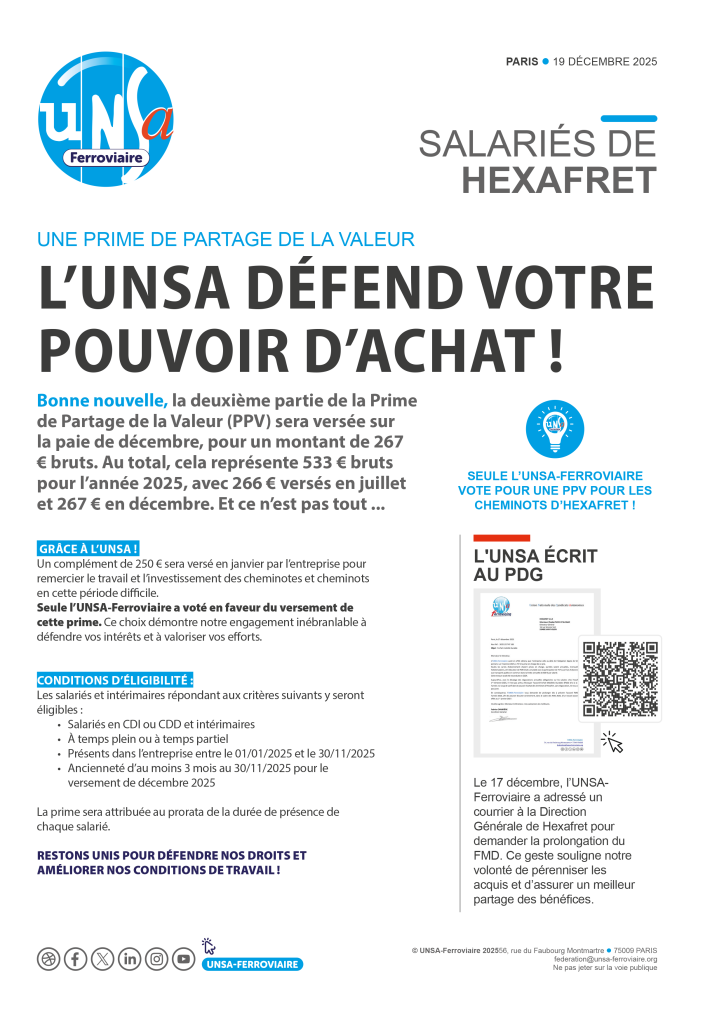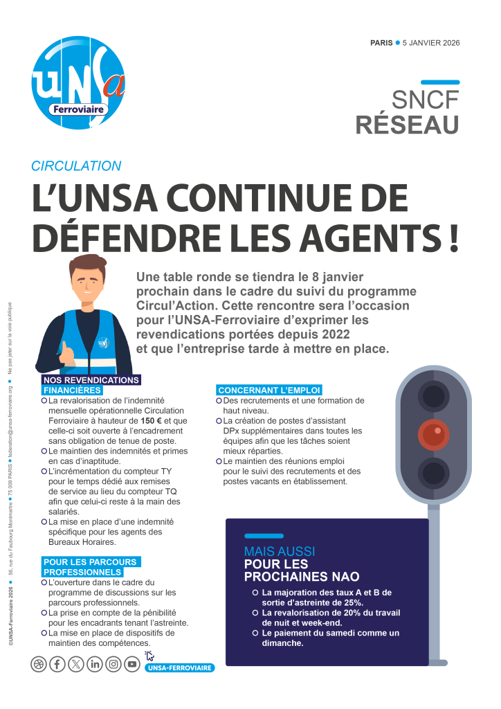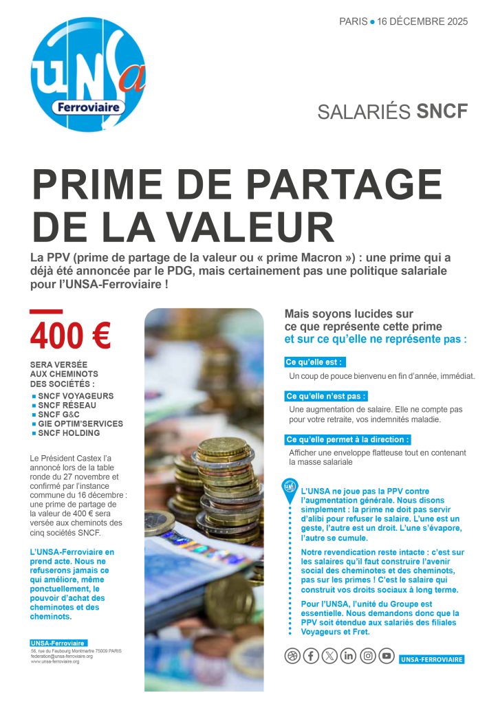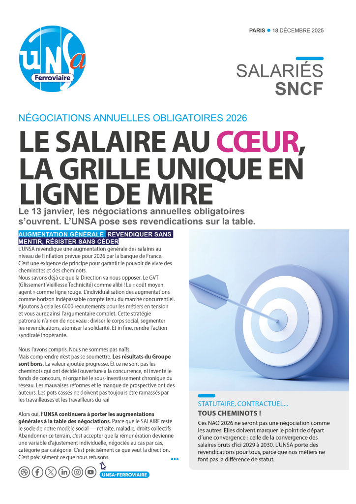 À la veille de la NAO 2026, l’UNSA exige des mesures concrètes : rattrapage de l’inflation, revalorisation des salaires minimums à 2 010 €, enveloppe d’augmentations individuelles de 2 % et création d’un intéressement groupe pouvant atteindre 2 000 € en année exceptionnelle. Elle revendique aussi la linéarisation annuelle de l’ancienneté, la réduction des délais de séjour en PR, la reconduction renforcée du FMD et l’ouverture vers une grille unique d’ici 2030.