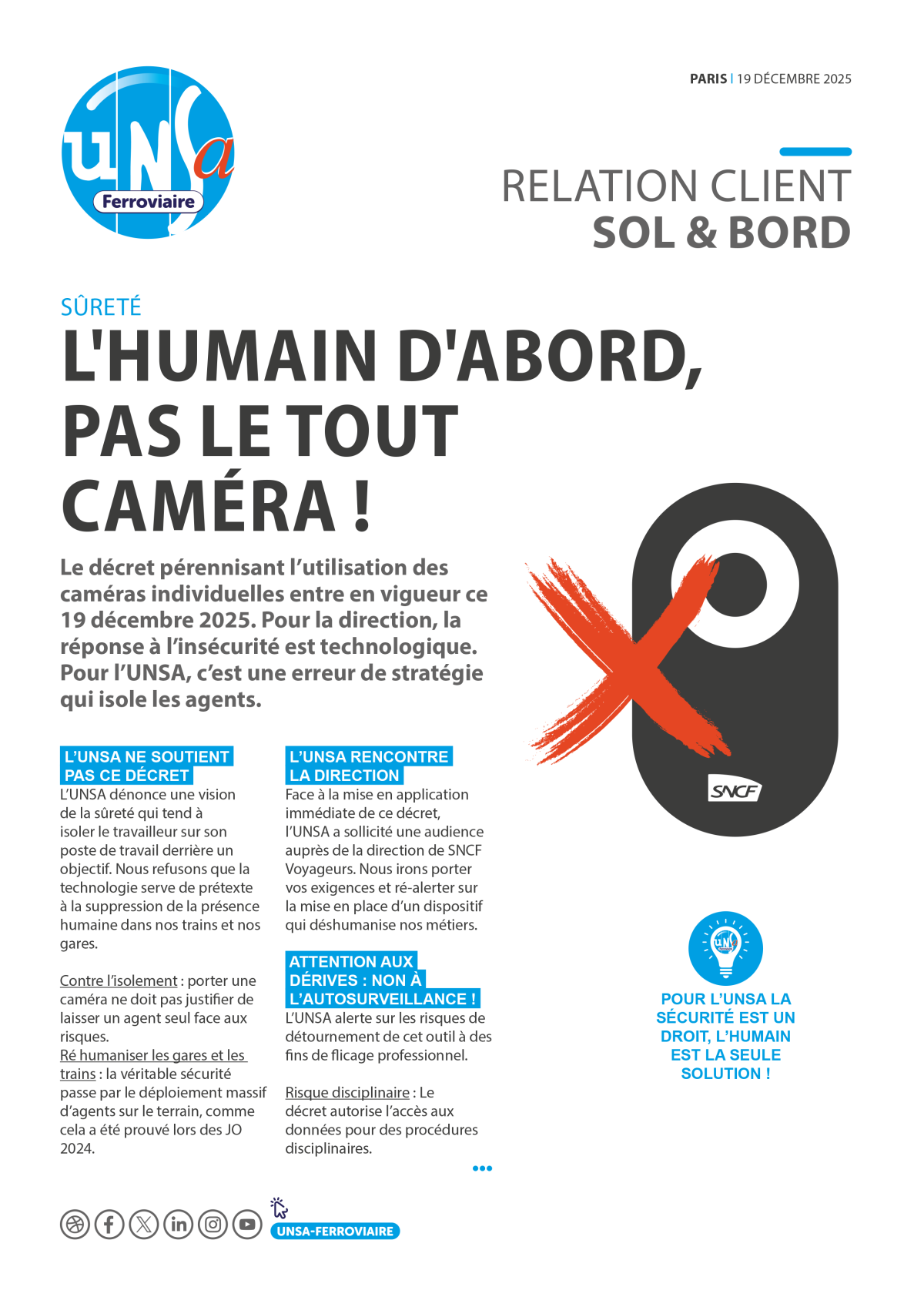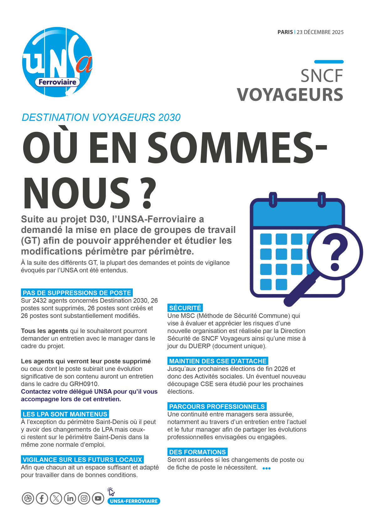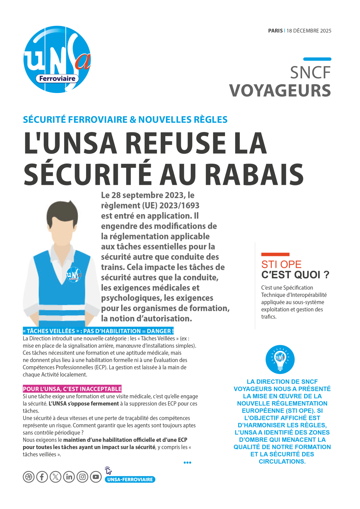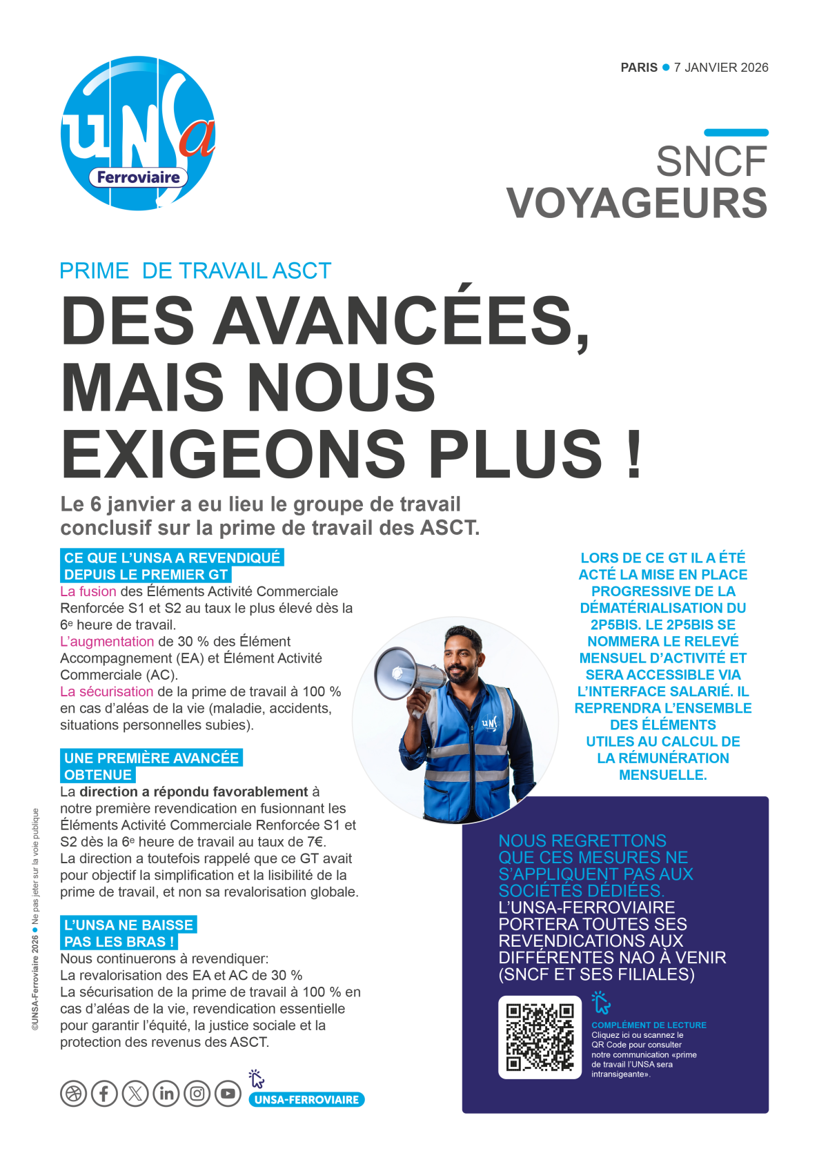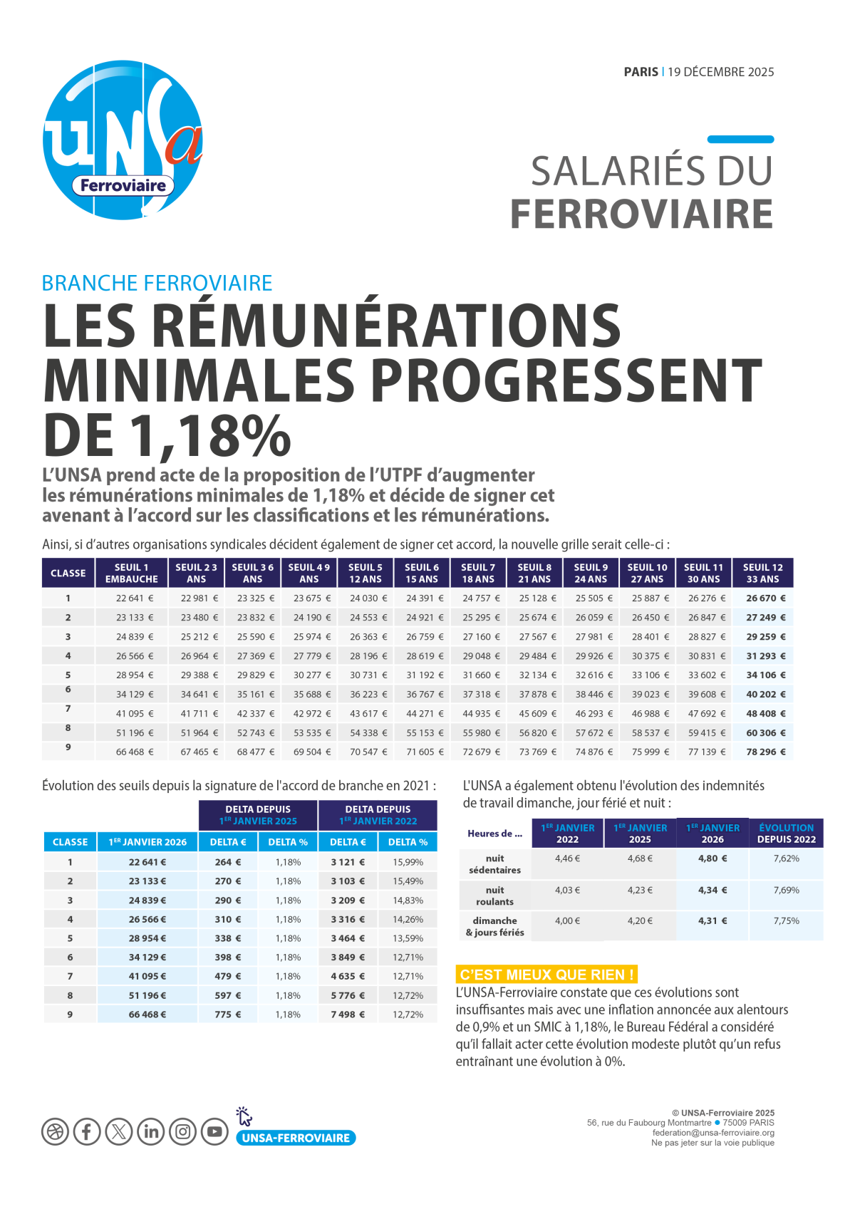 À la veille de la NAO 2026, l’UNSA exige des mesures concrètes : rattrapage de l’inflation, revalorisation des salaires minimums à 2 010 €, enveloppe d’augmentations individuelles de 2 % et création d’un intéressement groupe pouvant atteindre 2 000 € en année exceptionnelle. Elle revendique aussi la linéarisation annuelle de l’ancienneté, la réduction des délais de séjour en PR, la reconduction renforcée du FMD et l’ouverture vers une grille unique d’ici 2030.