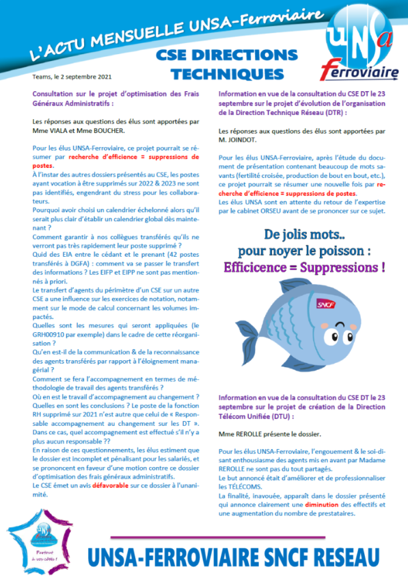 La Direction met en avant la situation économique et l’exigence de performance très élevée demandée avec la nécessité de définir les organisations les plus efficaces pour l’atteindre. Les élus UNSA-Ferroviaire soulignent l’obligation d’une consultation du CSE dès qu’il est question de réorganisations, ce qui ne manquera pas d’être rappelé!